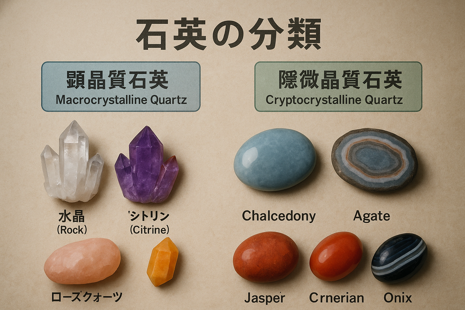 • 顕晶質石英:結晶がはっきりと見える(例:水晶、アメジスト)